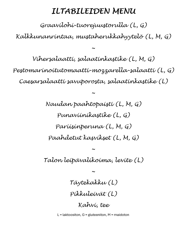 Virallisen osuuden jälkeen alkaa iltabileet maittavalla buffet ruokailulla jälkiruokineen ja juomineen. Ilta päättyy klo 02.00 mennessä.